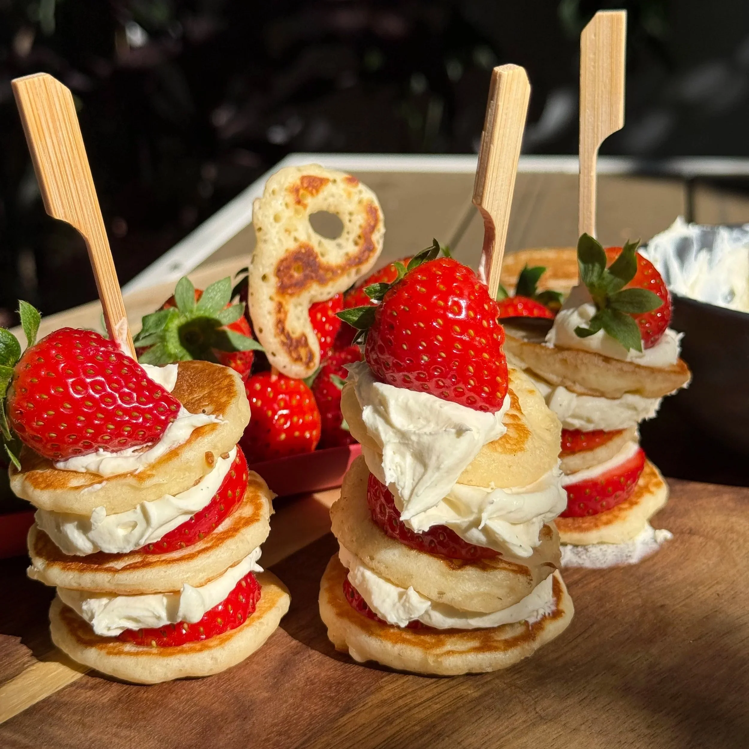 Mini pancake canapés with mascarpone cream and strawberries